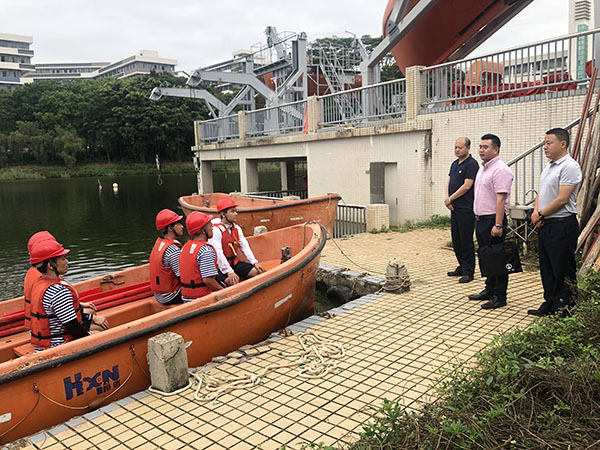 4月26日上午,广东海事局船员处郑永炳副处长、湛江海事局船员处处长邓平贵等一行到湖光校区现场调研我校参加中国船员技能大比武备赛情况。william威廉中文院长贾宝柱、实验训练中心负责人及指导老师陪同参加调研工作。