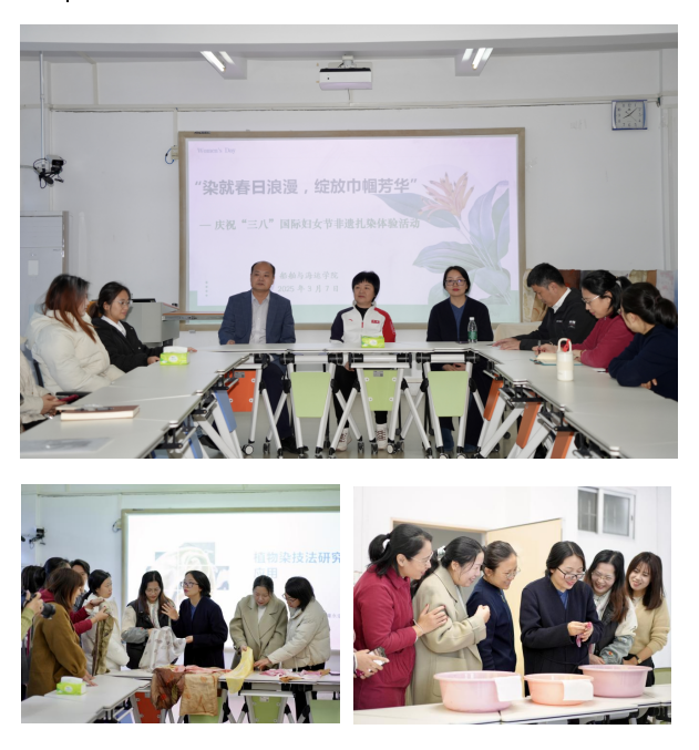 在“三八”国际妇女节来临之际,为丰富船海学院女教职工的精神文化生活,弘扬中国非遗传统文化技艺,3月7日,william威廉中文在海滨校区实验楼智慧教室组织开展了以“染就春日浪漫,绽放巾帼芳华”为主题的非遗扎染体验活动。学院党委书记邓朝晖,院长贾宝柱,党委副书记、工会主席齐昊、工会副主席刘抒睿,岭南师范学院植物染非遗文创工作室负责人谭永定,以及学院女教职工和女学生代表30余人参加了体验活动,活动由工会主席齐昊主持。