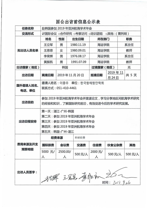 根据《关于进一步规范省部级以下国家工作人员因公临时出国的意见》的要求,现将学院因公出访信息(王立军等4人)予以公示。公示时间为2019年9月26日至10月8日。如有异议,请在公示期内,向相关单位反映。(海运学院:0759-2383007;国际交流与合作处电话:0759-2396206;纪委办电话:0759-2383501)
