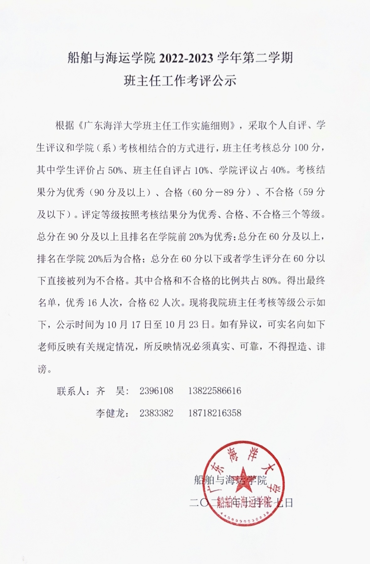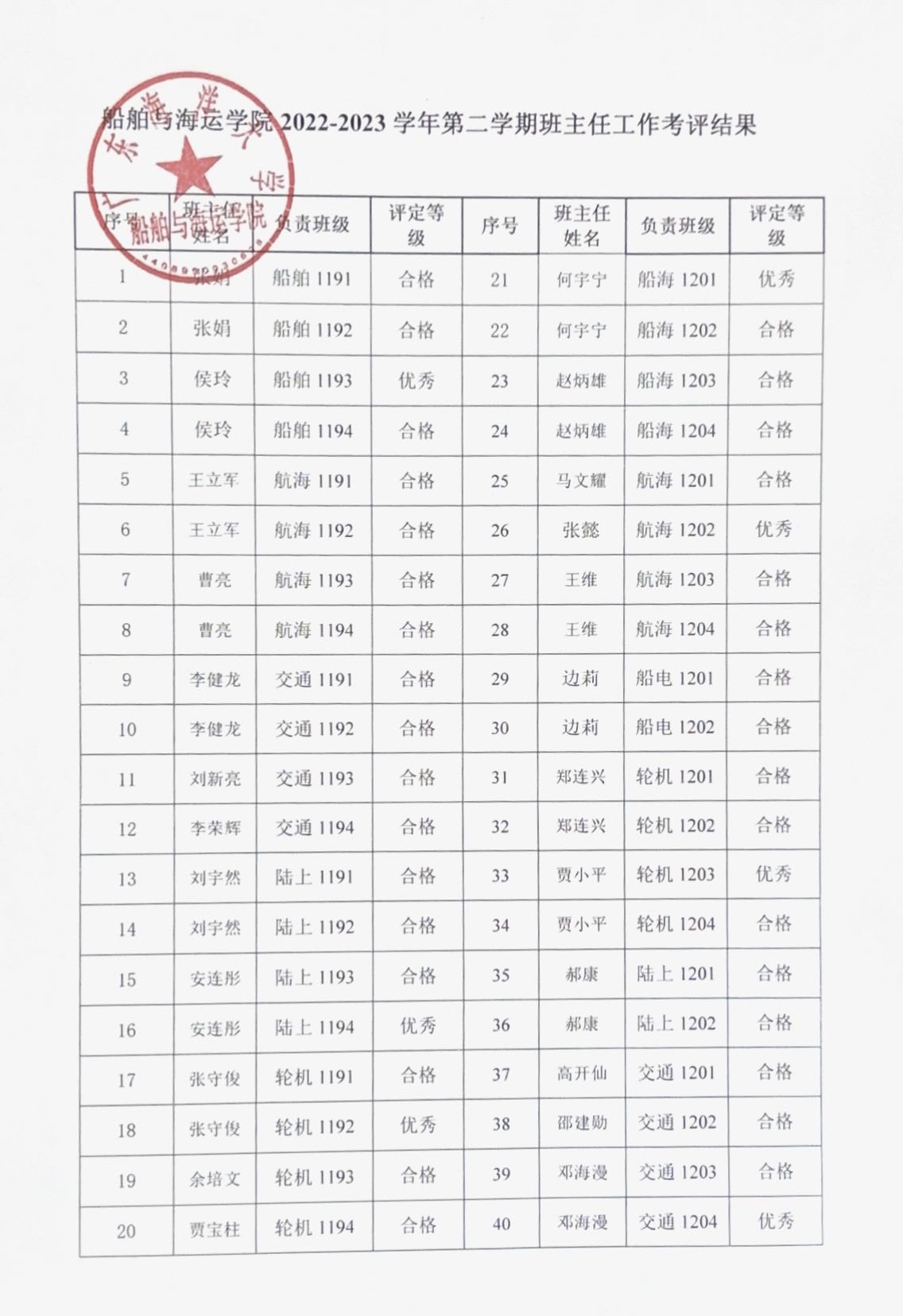 william威廉中文2022-2023学年第二学期班主任工作考评公示