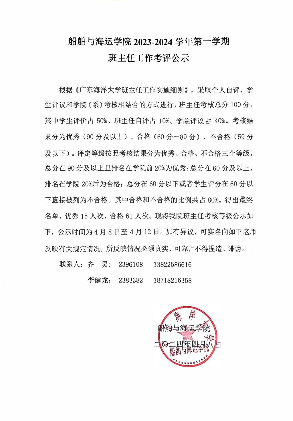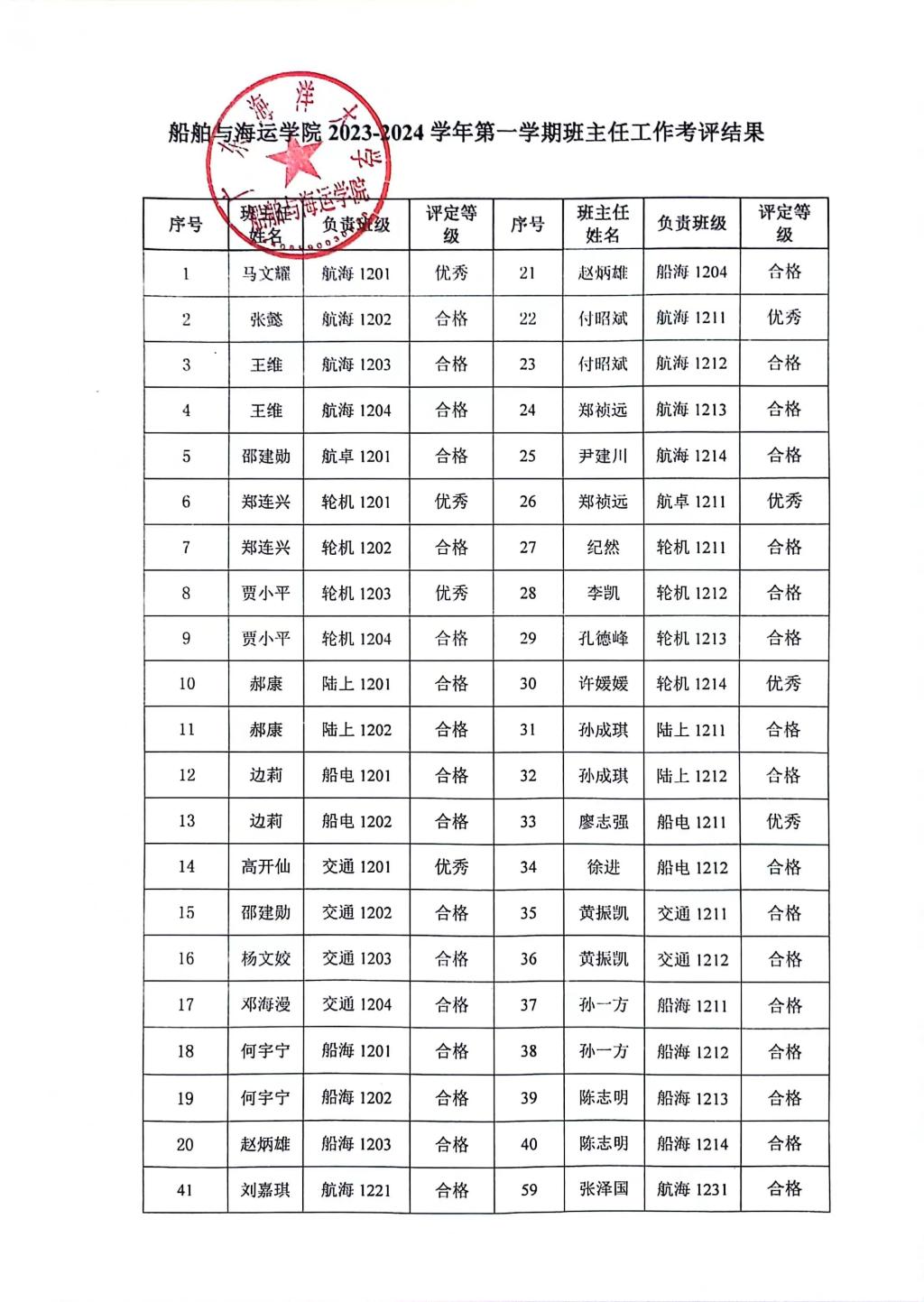 william威廉中文2023-2024学年第一学期班主任工作考评公示