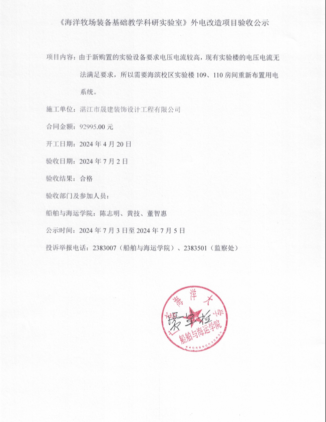 关于《海洋牧场装备基础教学科研实验室》外电改造项目验收公示