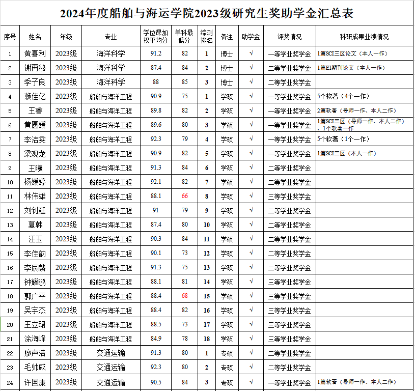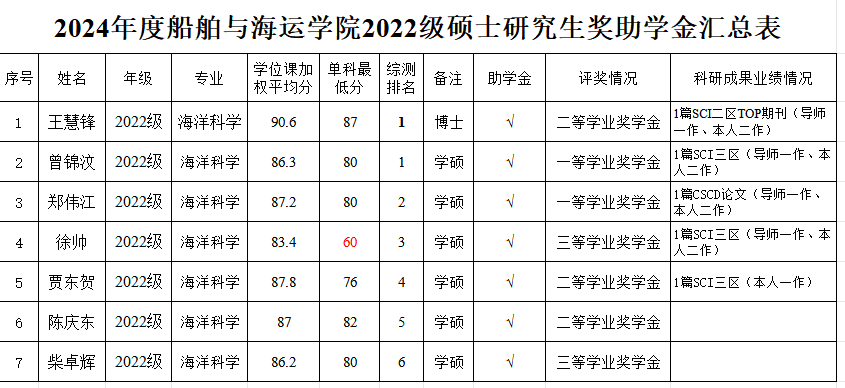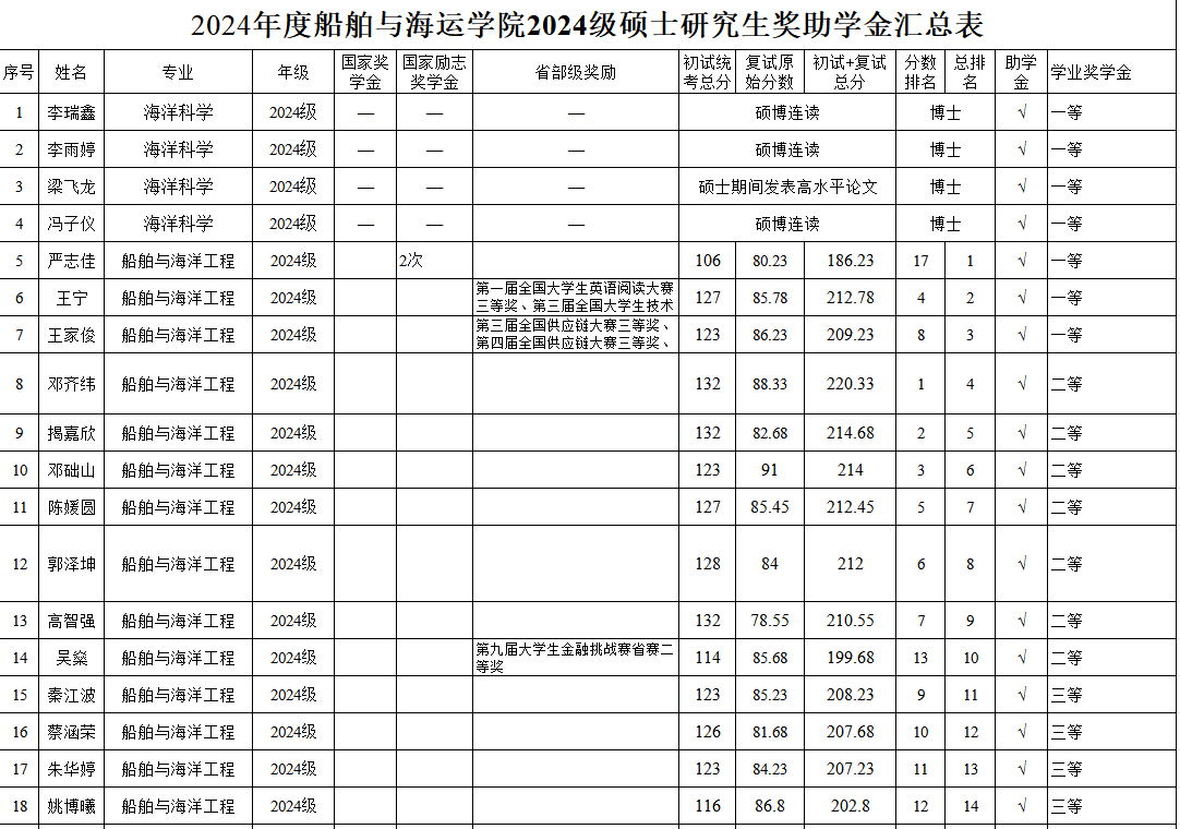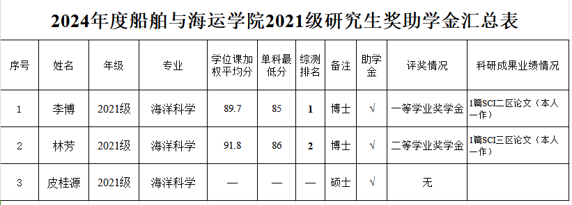 根据《广东省教育厅关于做好2024年秋季学期学生资助工作的通知》及《学校关于开展2024年研究生国家奖学金、学业奖学金和助学金评审工作的通知》精神,按照《WilliamHill中文全日制研究生奖助学金实施办法》,经个人申请、学院评审小组认真审核及严格评选,拟确定获得研究生助学金、学业奖学金人员名单。其中,2021级海洋科学专业皮桂源同学因休学补发半年助学金,其余硕士研究生均不分等级全部获得助学金。现将评审名单进行公示(详见附表)。