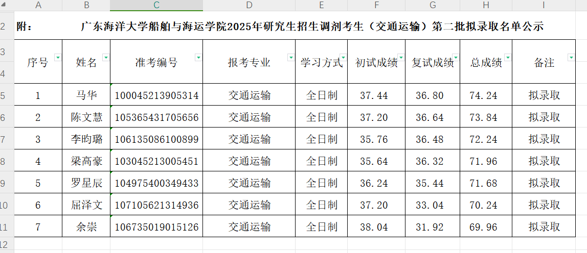 根据学校及我院研究生招生工作的相关文件精神和要求,经学院研究生招生录取工作领导小组审定,将我院2025年硕士研究生招生调剂(交通运输)第二批考生复试成绩及拟录取名单公示。如有拟录取考生自动放弃,按总成绩排名依次递进。