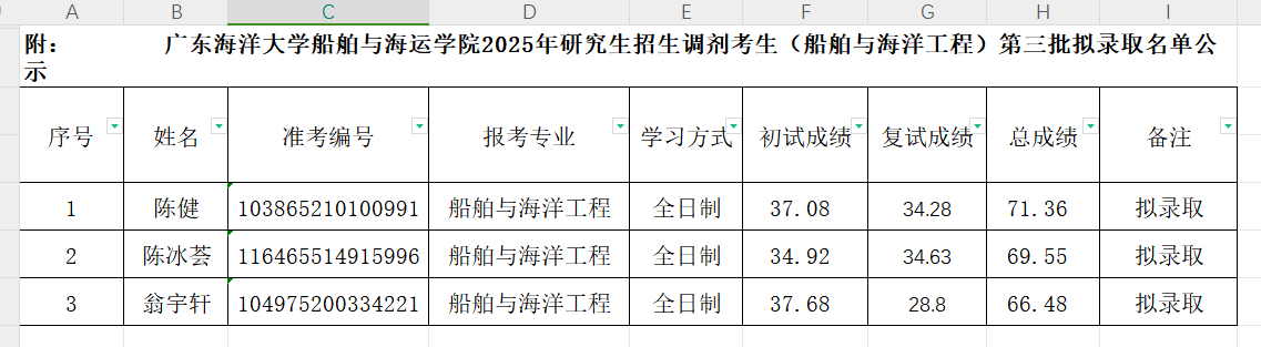 根据学校及我院研究生招生工作的相关文件精神和要求,经学院研究生招生录取工作领导小组审定,将我院2025年硕士研究生招生调剂(船舶与海洋工程)第三批考生复试成绩及拟录取名单公示。如有拟录取考生自动放弃,按总成绩排名依次递进。