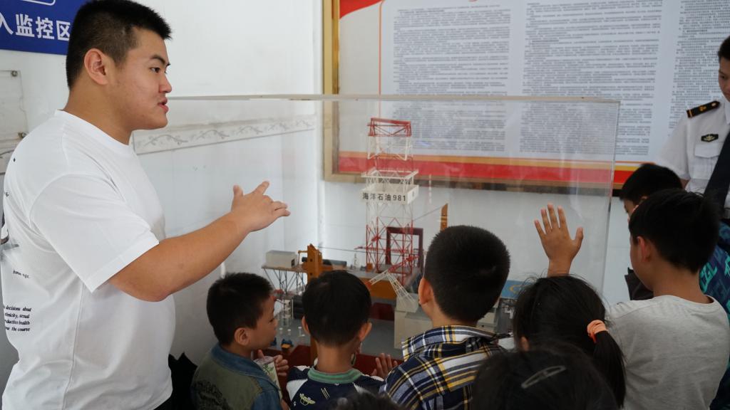 活动首站,学生们来到了海洋石油981平台展区。这座海上钻井平台的雄伟身姿,不仅展示了我国在海洋石油开采技术上的重大突破,更是科技进步与人类探索精神的象征。志愿者们通过生动的讲解,让孩子们深刻理解了981平台背后的智慧与汗水,激发了他们对科学探索的热情。