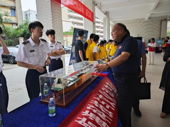 开幕式精彩节目表演结束后,湛江市第十七中学学生有序来到船舶模型展台前参观。根据我们所展示的船舶模型,为学生们进行了细致入微地讲解。近在咫尺的船舶模型与生动的讲解,激发了学生们对航海世界的强烈好奇心与探索欲。参观结束后,志愿者向学生们发放基地宣传单。